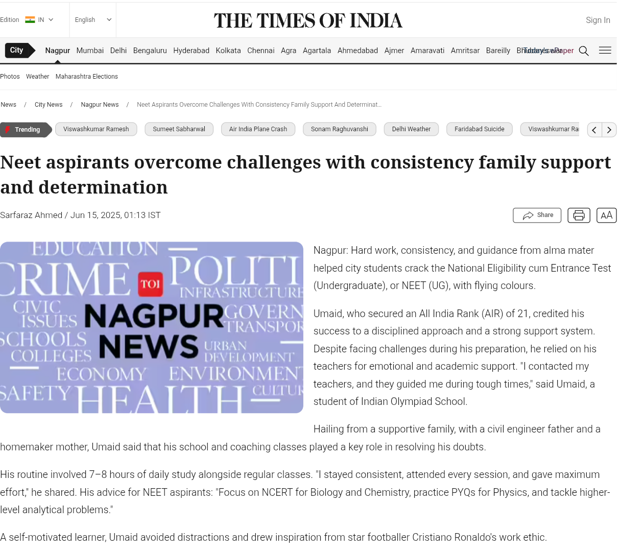 Nagpur: Hard work, consistency, and guidance from alma mater helped city students crack the National Eligibility cum Entrance Test (Undergraduate), or NEET (UG), with flying colours.