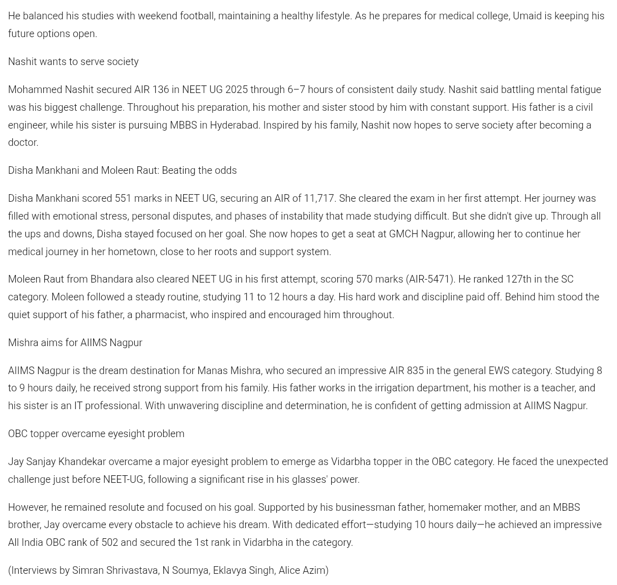 Disha Mankhani and Moleen Raut: Beating the odds Disha Mankhani scored 551 marks in NEET UG, securing an AIR of 11,717. She cleared the exam in her first attempt. Her journey was filled with emotional stress, personal disputes, and phases of instability that made studying difficult. But she didn’t give up. Through all the ups and downs, Disha stayed focused on her goal. She now hopes to get a seat at GMCH Nagpur, allowing her to continue her medical journey in her hometown, close to her roots and support system.