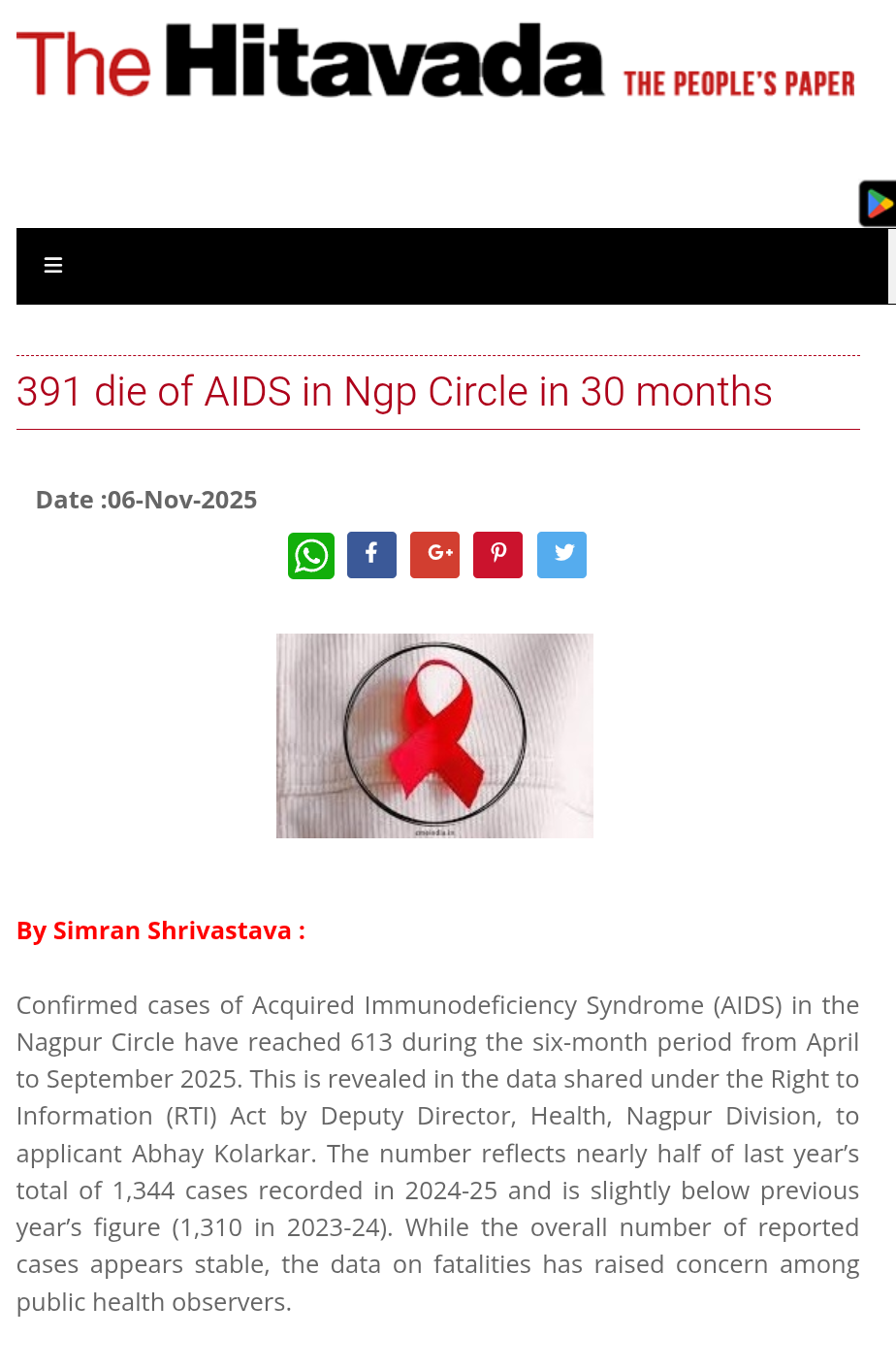 Confirmed cases of Acquired Immunodeficiency Syndrome (AIDS) in the Nagpur Circle have reached 613 during the six-month period from April to September 2025. This is revealed in the data shared under the Right to Information (RTI) Act by Deputy Director, Health, Nagpur Division, to applicant Abhay Kolarkar. The number reflects nearly half of last year’s total of 1,344 cases recorded in 2024-25 and is slightly below previous year’s figure (1,310 in 2023-24). While the overall number of reported cases appears stable, the data on fatalities has raised concern among public health observers.