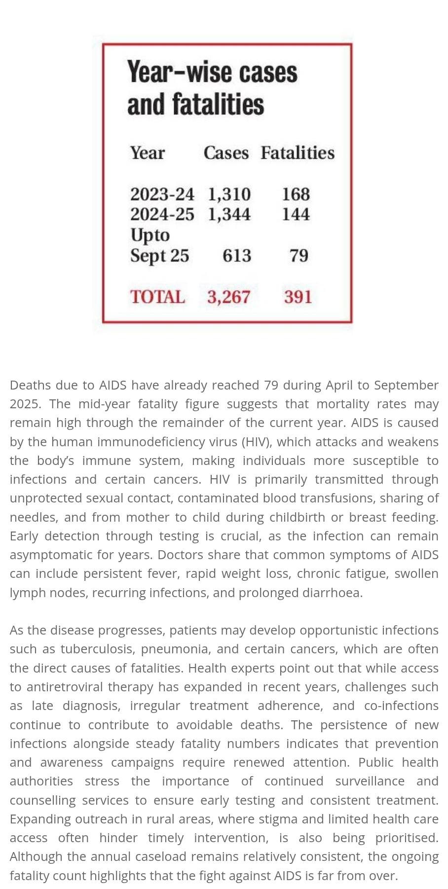 Deaths due to AIDS have already reached 79 during April to September 2025. The mid-year fatality figure suggests that mortality rates may remain high through the remainder of the current year. AIDS is caused by the human immunodeficiency virus (HIV), which attacks and weakens the body’s immune system, making individuals more susceptible to infections and certain cancers. HIV is primarily transmitted through unprotected sexual contact, contaminated blood transfusions, sharing of needles, and from mother to child during childbirth or breast feeding. Early detection through testing is crucial, as the infection can remain asymptomatic for years. Doctors share that common symptoms of AIDS can include persistent fever, rapid weight loss, chronic fatigue, swollen lymph nodes, recurring infections, and prolonged diarrhoea.