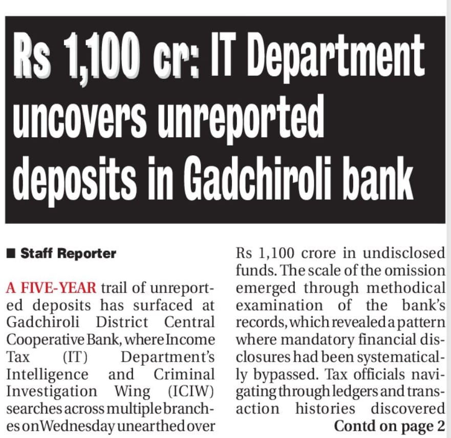A FIVE-YEAR trail of unreported deposits has surfaced at Gadchiroli District Central Cooperative Bank, where Income Tax (IT) Department’s Intelligence and Criminal Investigation Wing (ICIW) searches across multiple branches on Wednesday unearthed over Rs 1,100 crore in undisclosed funds. The scale of the omission emerged through methodical examination of the bank’s records, which revealed a pattern where mandatory financial disclosures had been systematically bypassed. Tax officials navigating through ledgers and transaction histories discovered