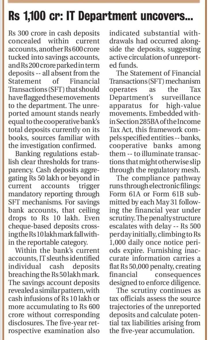 Rs 300 crore in cash deposits concealed within current accounts, another Rs 600 crore tucked into savings accounts, and Rs 200 crore parked in term deposits -- all absent from the Statement of Financial Transactions (SFT) that should have flagged these movements to the department. The unreported amount stands nearly equal to the cooperative bank’s total deposits currently on its books, sources familiar with the investigation confirmed.