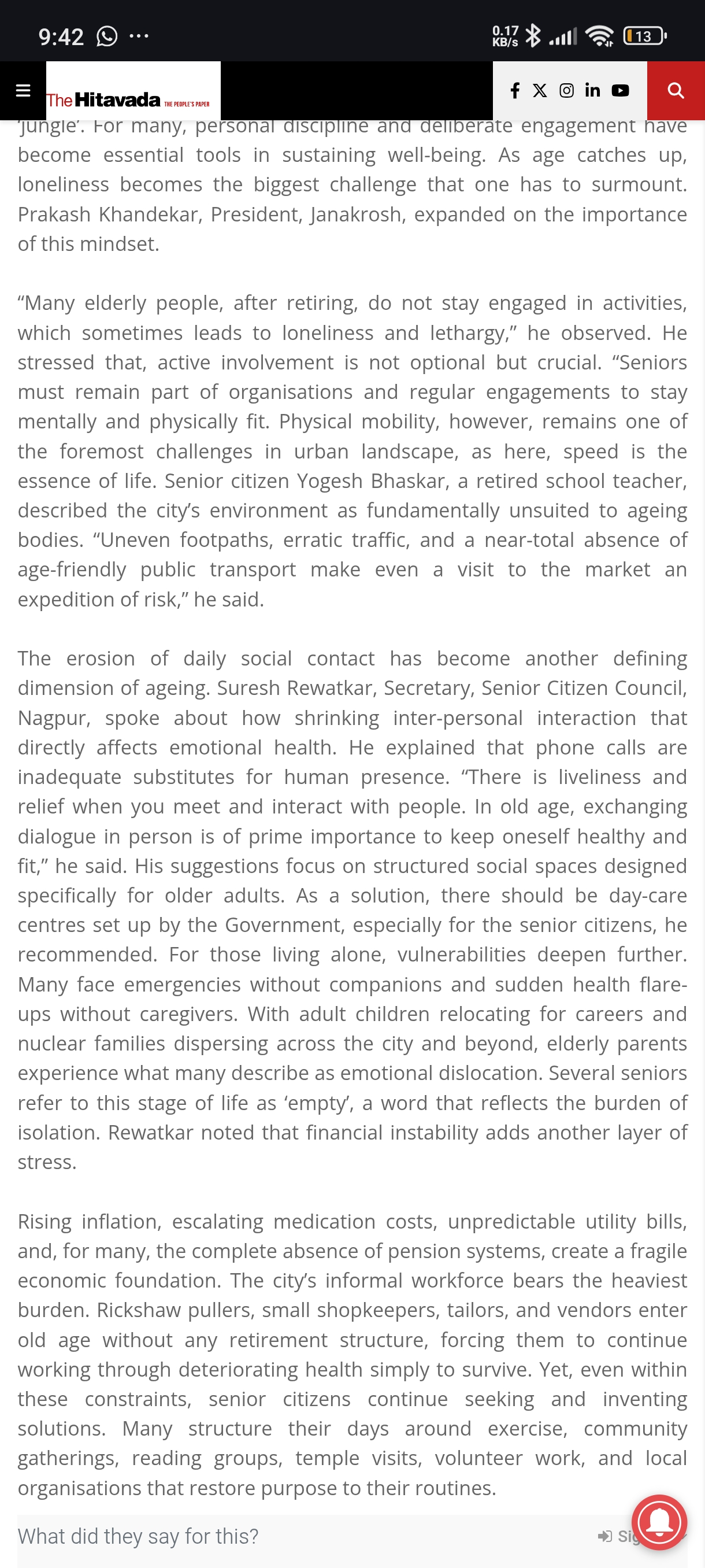 The erosion of daily social contact has become another defining dimension of ageing. Suresh Rewatkar, Secretary, Senior Citizen Council, Nagpur, spoke about how shrinking inter-personal interaction that directly affects emotional health. He explained that phone calls are inadequate substitutes for human presence. “There is liveliness and relief when you meet and interact with people. In old age, exchanging dialogue in person is of prime importance to keep oneself healthy and fit,” he said. His suggestions focus on structured social spaces designed specifically for older adults. As a solution, there should be day-care centres set up by the Government, especially for the senior citizens, he recommended. For those living alone, vulnerabilities deepen further. Many face emergencies without companions and sudden health flare-ups without caregivers. With adult children relocating for careers and nuclear families dispersing across the city and beyond, elderly parents experience what many describe as emotional dislocation. Several seniors refer to this stage of life as ‘empty’, a word that reflects the burden of isolation. Rewatkar noted that financial instability adds another layer of stress.