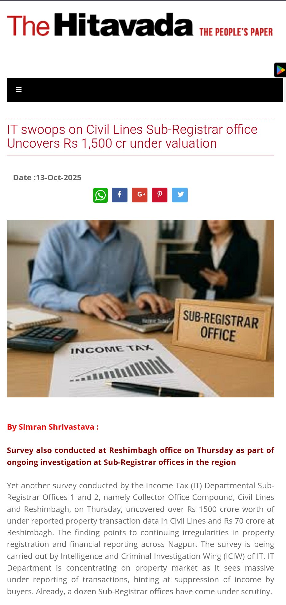 Yet another survey conducted by the Income Tax (IT) Departmental Sub-Registrar Offices 1 and 2, namely Collector Office Compound, Civil Lines and Reshimbagh, on Thursday, uncovered over Rs 1500 crore worth of under reported property transaction data in Civil Lines and Rs 70 crore at Reshimbagh. The finding points to continuing irregularities in property registration and financial reporting across Nagpur. The survey is being carried out by Intelligence and Criminal Investigation Wing (ICIW) of IT. IT Department is concentrating on property market as it sees massive under reporting of transactions, hinting at suppression of income by buyers. Already, a dozen Sub-Registrar offices have come under scrutiny.