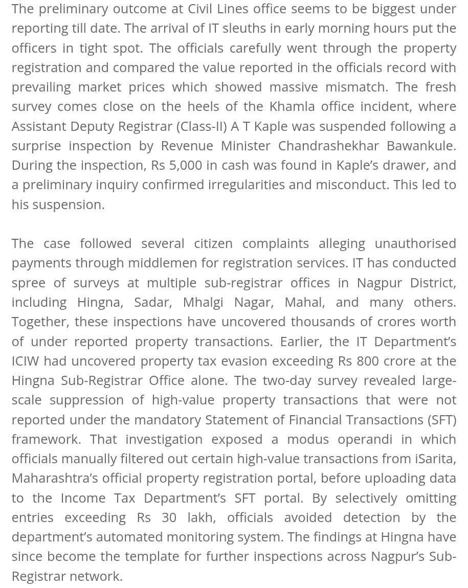 The case followed several citizen complaints alleging unauthorised payments through middlemen for registration services. IT has conducted spree of surveys at multiple sub-registrar offices in Nagpur District, including Hingna, Sadar, Mhalgi Nagar, Mahal, and many others. Together, these inspections have uncovered thousands of crores worth of under reported property transactions. Earlier, the IT Department’s ICIW had uncovered property tax evasion exceeding Rs 800 crore at the Hingna Sub-Registrar Office alone. The two-day survey revealed large-scale suppression of high-value property transactions that were not reported under the mandatory Statement of Financial Transactions (SFT) framework. That investigation exposed a modus operandi in which officials manually filtered out certain high-value transactions from iSarita, Maharashtra’s official property registration portal, before uploading data to the Income Tax Department’s SFT portal. By selectively omitting entries exceeding Rs 30 lakh, officials avoided detection by the department’s automated monitoring system. The findings at Hingna have since become the template for further inspections across Nagpur’s Sub-Registrar network.
