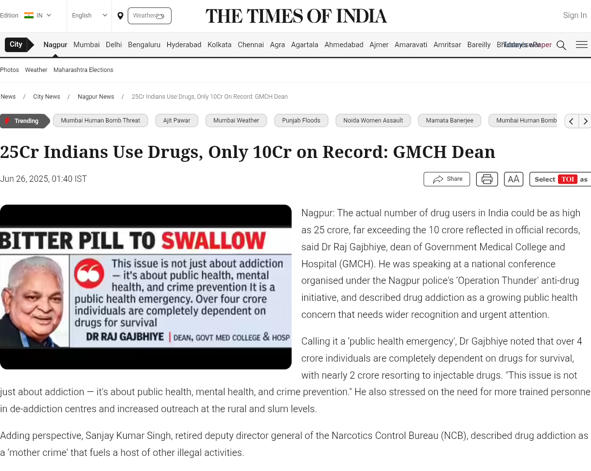 Nagpur: The actual number of drug users in India could be as high as 25 crore, far exceeding the 10 crore reflected in official records, said Dr Raj Gajbhiye, dean of Government Medical College and Hospital (GMCH). He was speaking at a national conference organised under the Nagpur police's 'Operation Thunder' anti-drug initiative, and described drug addiction as a growing public health concern that needs wider recognition and urgent attention.