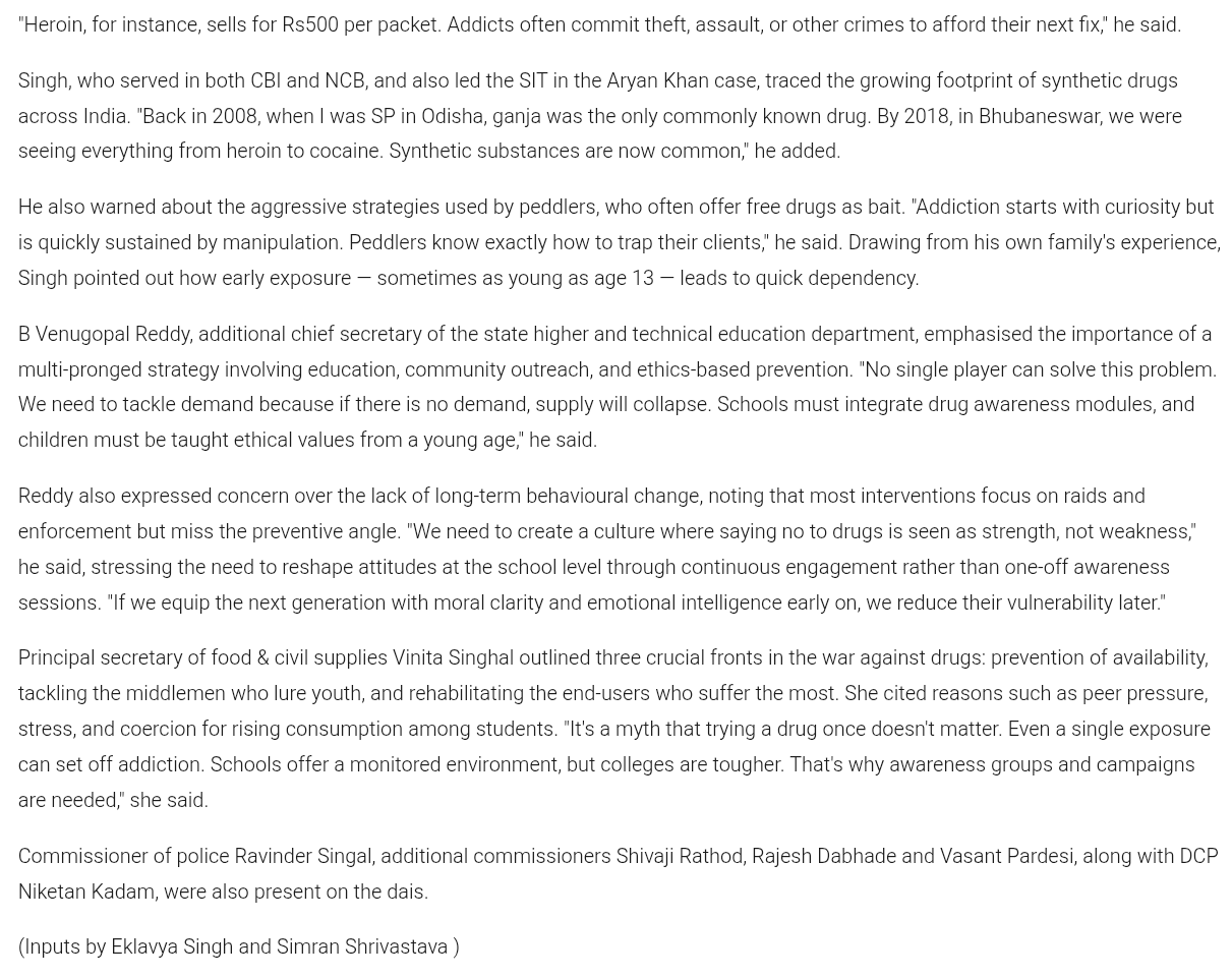 Principal secretary of food & civil supplies Vinita Singhal outlined three crucial fronts in the war against drugs: prevention of availability, tackling the middlemen who lure youth, and rehabilitating the end-users who suffer the most. She cited reasons such as peer pressure, stress, and coercion for rising consumption among students. "It's a myth that trying a drug once doesn't matter. Even a single exposure can set off addiction. Schools offer a monitored environment, but colleges are tougher. That's why awareness groups and campaigns are needed," she said.