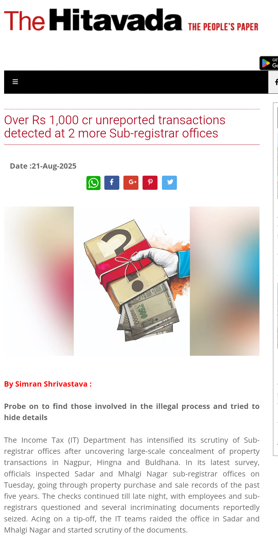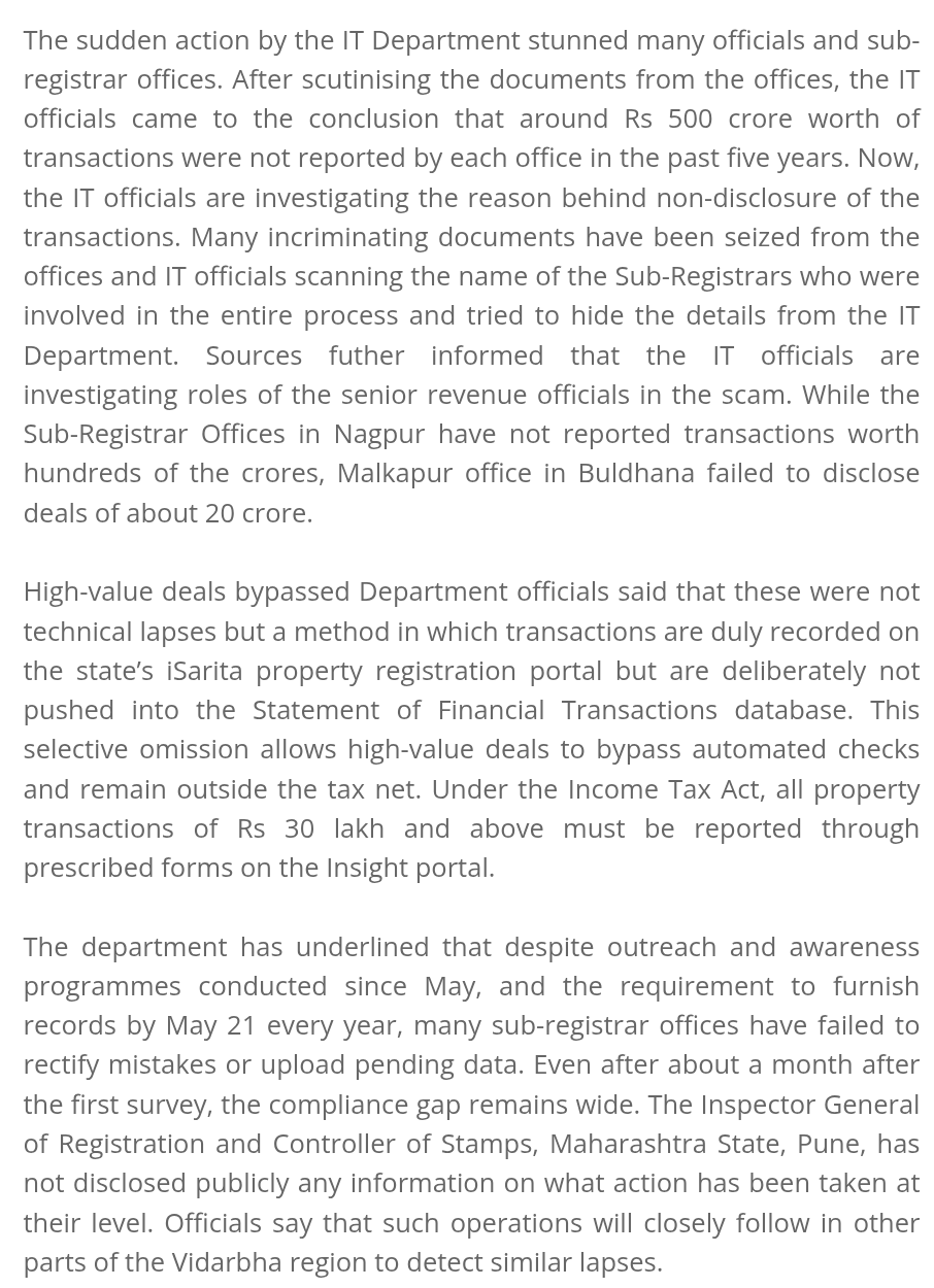 The sudden action by the IT Department stunned many officials and sub-registrar offices. After scrutinising the documents from the offices, the IT officials came to the conclusion that around Rs 500 crore worth of transactions were not reported by each office in the past five years. Now, the IT officials are investigating the reason behind non-disclosure of the transactions. Many incriminating documents have been seized from the offices and IT officials scanning the name of the Sub-Registrars who were involved in the entire process and tried to hide the details from the IT Department. Sources futher informed that the IT officials are investigating roles of the senior revenue officials in the scam. While the Sub-Registrar Offices in Nagpur have not reported transactions worth hundreds of the crores, Malkapur office in Buldhana failed to disclose deals of about 20 crore.