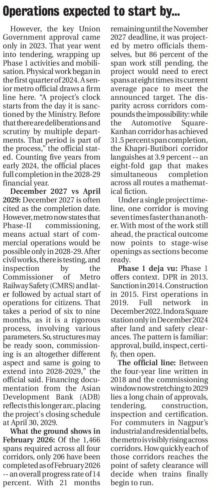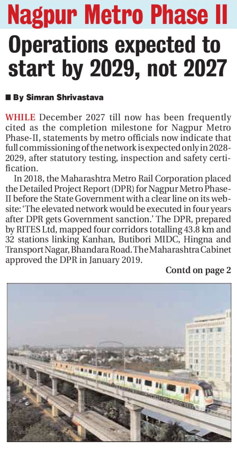 WHILE December 2027 till now has been frequently cited as the completion milestone for Nagpur Metro Phase-II, statements by metro officials now indicate that full commissioning of the network is expected only in 2028-2029, after statutory testing, inspection and safety certification.