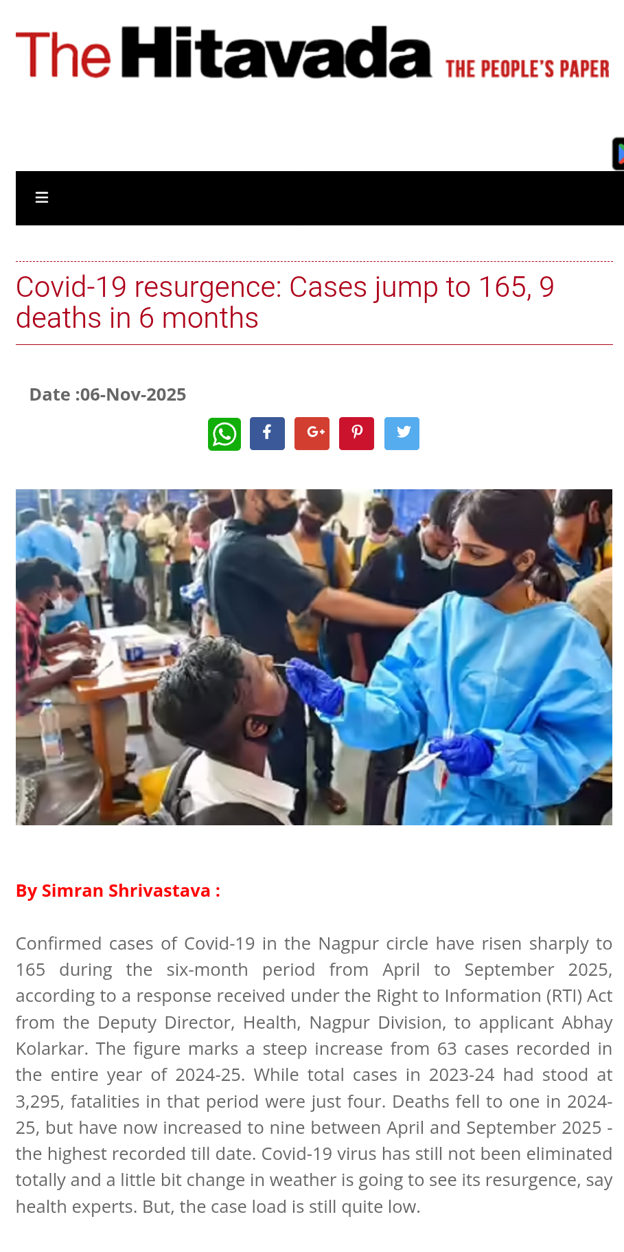 Confirmed cases of Covid-19 in the Nagpur circle have risen sharply to 165 during the six-month period from April to September 2025, according to a response received under the Right to Information (RTI) Act from the Deputy Director, Health, Nagpur Division, to applicant Abhay Kolarkar. The figure marks a steep increase from 63 cases recorded in the entire year of 2024-25. While total cases in 2023-24 had stood at 3,295, fatalities in that period were just four. Deaths fell to one in 2024-25, but have now increased to nine between April and September 2025 - the highest recorded till date. Covid-19 virus has still not been eliminated totally and a little bit change in weather is going to see its resurgence, say health experts. But, the case load is still quite low.