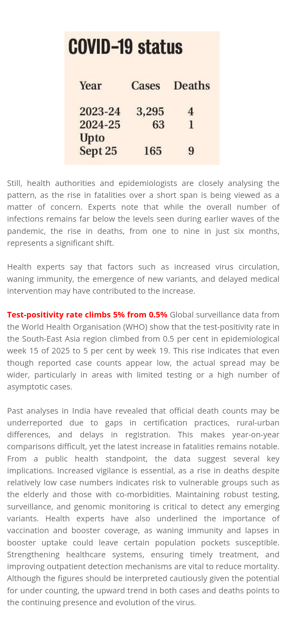 Test-positivity rate climbs 5% from 0.5% Global surveillance data from the World Health Organisation (WHO) show that the test-positivity rate in the South-East Asia region climbed from 0.5 per cent in epidemiological week 15 of 2025 to 5 per cent by week 19. This rise indicates that even though reported case counts appear low, the actual spread may be wider, particularly in areas with limited testing or a high number of asymptotic cases.